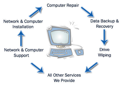 Computer Repair, Home Office Network Setup and Support, Support for Windows and Mac, Antivirus/Antispyware Solutions, Data Backup and Recovery, Secure Internet and Wireless setup, Email/Spam Solutions, Slide Show Presentations for All Types of Celebrations, Preventive Maintenance Service, On-site Support, Hard drive wiping/Data clearing,